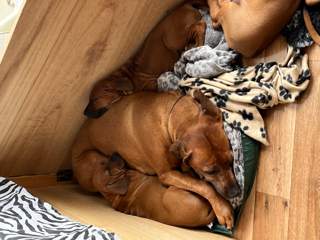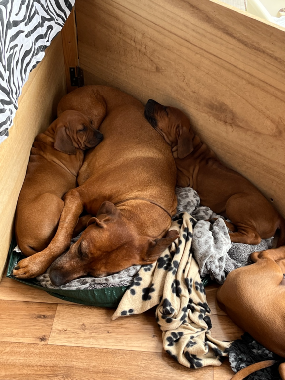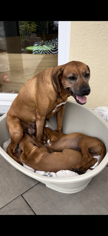 Welpen ganz vorbildlich und sehr fürsorglich, man könnte meinen, sie hätte nie etwas anderes gemacht! Wir erfreuen uns an den süßen dicken Möppels - sie haben dank prall gefüllter Milchbar alle schon