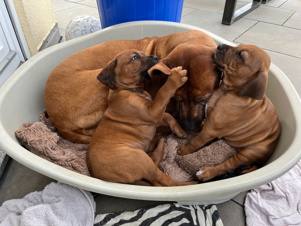 Mamas Milch schmeckt immer noch erste Sahne - und so sehen unsere dicken Klopperchen auch aus! Immer noch steht vor allem Trinken und danach ausgiebig schlafen auf dem Programm und Yatani macht dabei nach wie vor einen Wahnsinnsjob! Sie hütet die Kleinen wie ihren Augapfel und legt sich auch noch dazu, wenn sie schlafen und sie sich mal vom „Nama-Stress“ ausruhen könnte - eine super Hundemama also, wobei sie uns absolut vertraut und auch unsere Kids immer gern gesehener Gast in Wurfkiste und Auslauf sind - dann überlässt sie doch mal uns das Baby-Hüten…